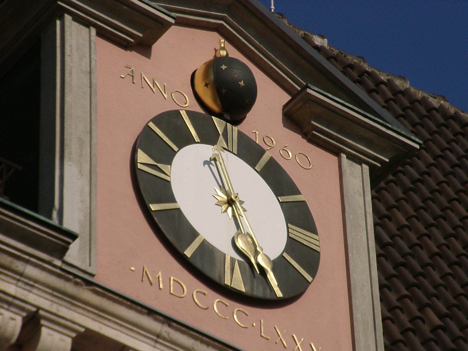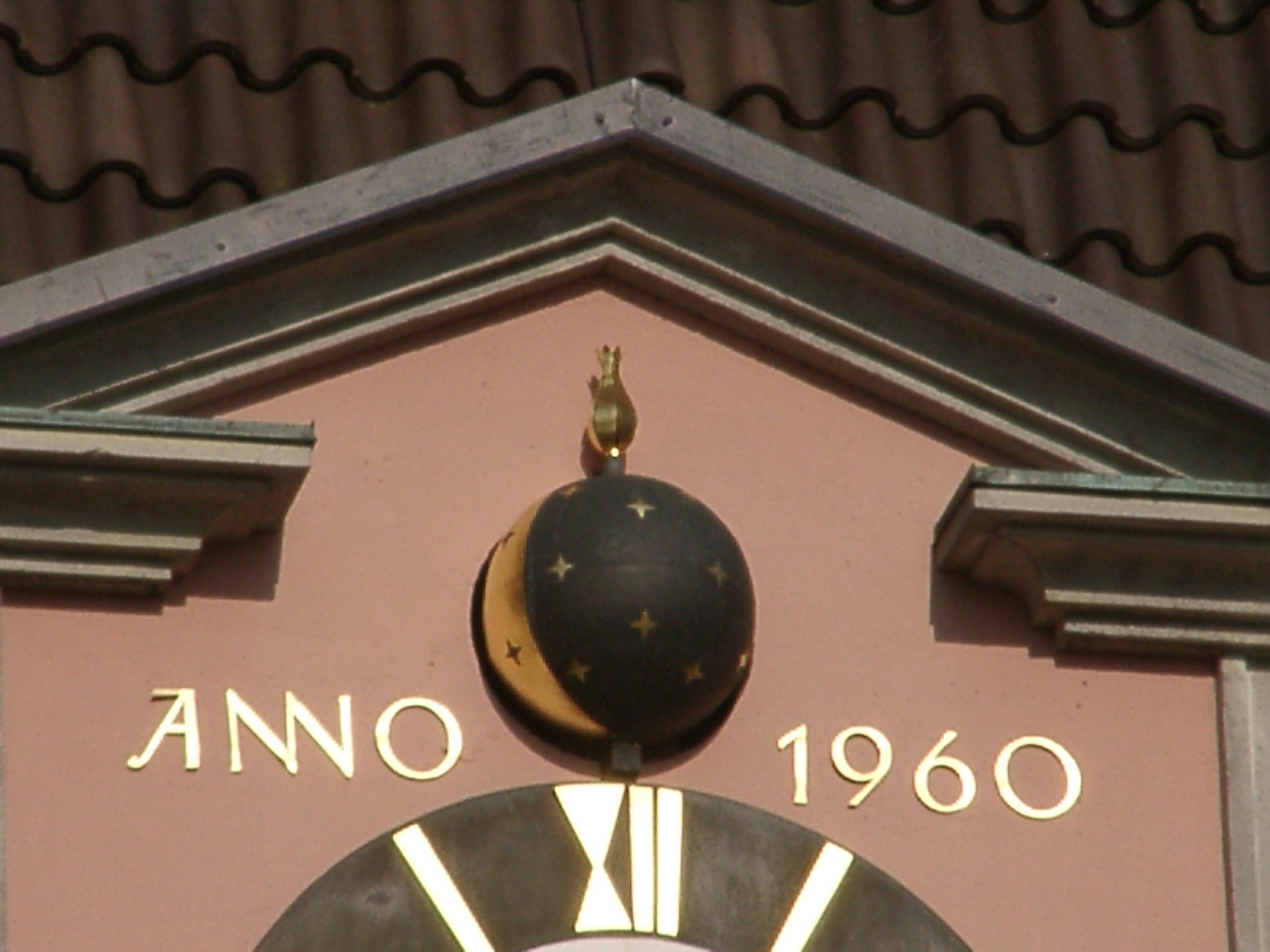 Bei dieser astronomische Uhr handelt es sich um eine Monduhr bei der die Mondphasen mit einer Mondkugel dargestellt wird. Die Mondkugel hat eine schwarze Seite für Neumond und eine goldene Seite für Vollmond. Die Mondkugel ist durch Sterne verziert.