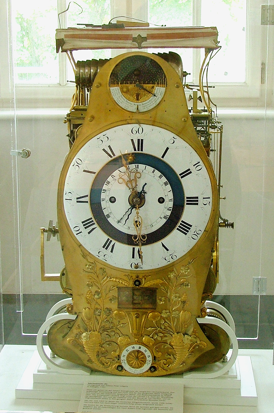 Die Uhr hat insgesamt 7 Federwerke und 16 Knöpfe oder Hebel um die Uhr zu regulieren, oder die einzelnen Melodien der Orgel oder des Glockenspiels abspielen zu lassen.